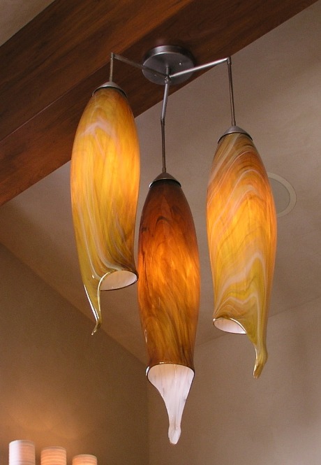 Commissioned Chandelier for private residence: Stretched blown glass pendants. Brushed stainless steel frame. Designed and produced by Samuel Art Glass, LLC. 30” x 42”