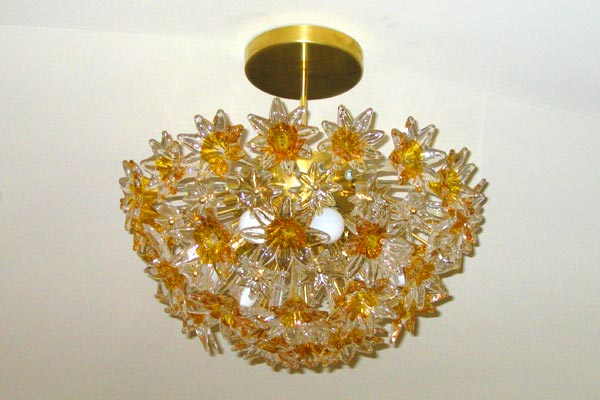 Commissioned Chandelier for private residence: Replica of a Venetian chandelier. Blown glass flowers mounted in a brass frame. Produced by Samuel Art Glass, LLC. 24” in diameter